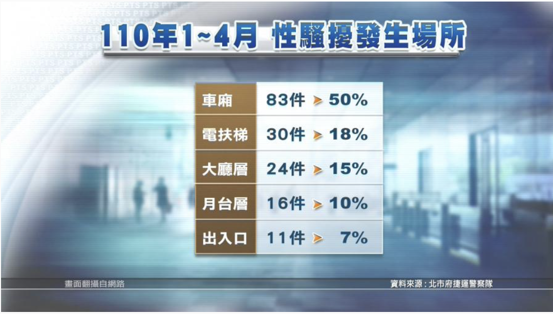 台北市警察局捷運警察隊日前統計捷運的性騷擾案件資料,得出性騷擾案件發生最多的站點、時段與場所等重要資訊。統計結果發現,發生性騷擾案件前三多的站點依序是忠孝復興、台北車站與忠孝新生站,而發生在車廂內的案件佔了一半。