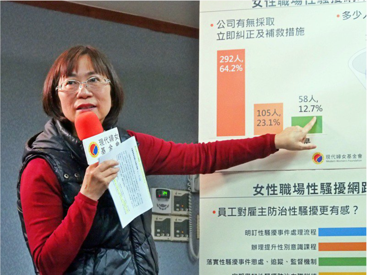 近日,民間團體現代婦女基金會舉辦記者會,公布「我們與性騷擾的距離——女性職場性騷擾網路大調查」結果。結果顯示,有43%女性遭遇過職場性騷擾,其中性騷擾行為人與被害人關係為上司及員工關係的案件高達41.7%。在面對職場性騷擾事件時,僅有10.3%女性曾提出申訴。